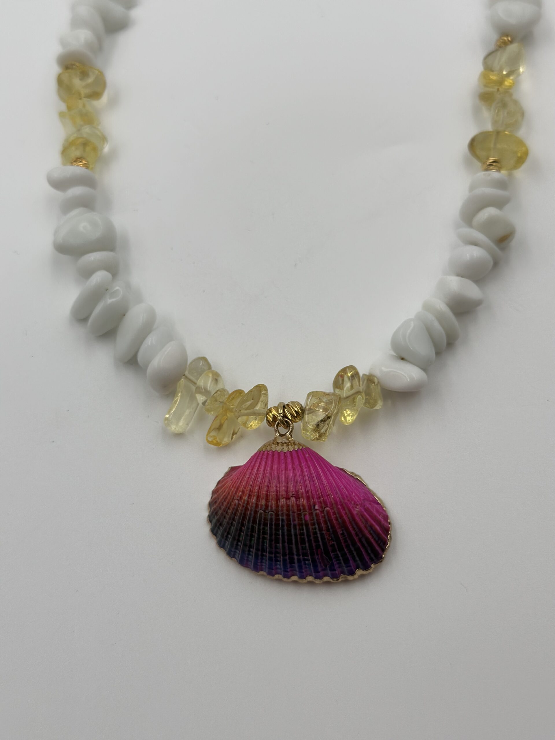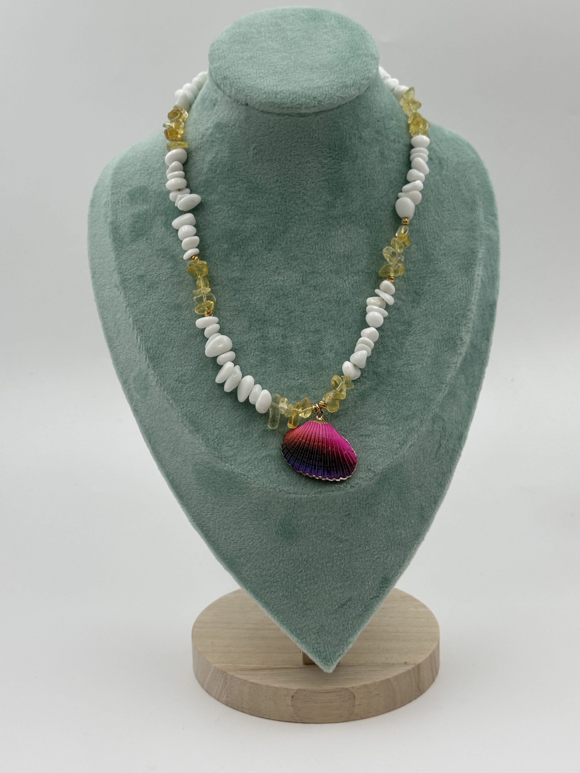 Beyaz ve Sarı Boncuklu Deniz Kabuklu Bohem Kolye
